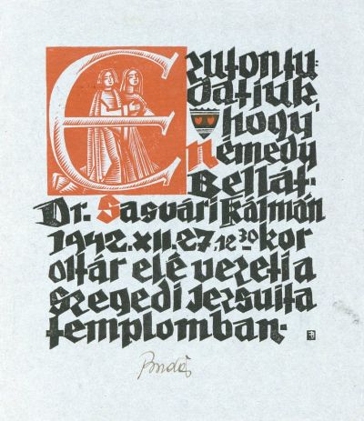 Occasional graphics - Announcement of wedding: Dr. Kálmán Sasvári leads Bella Némedy ... to the altar