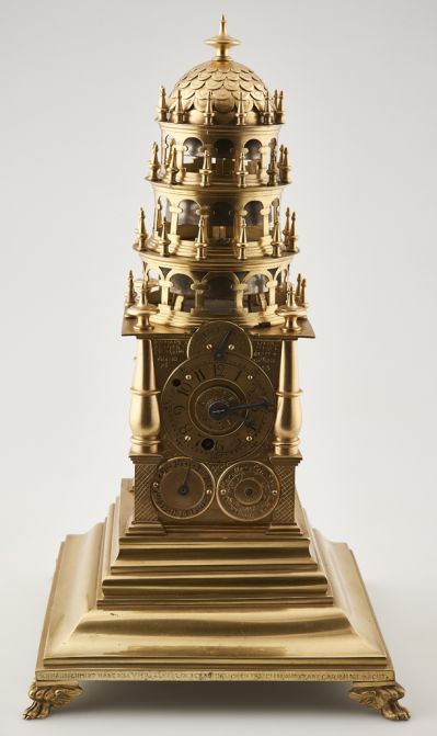 Verge escapement with six dials. The steeple-shaped case stands on a square-shaped plinth, decorated with architectural motifs, such as tempietto columns and an arch. An engraved maker's sign in majuscules appears on the front, above the middle dial: