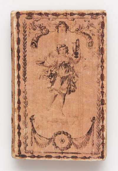 The paper plates are covered with pink satin. The front surface shows an engraving: at the bottom of a flower and leaf framework is a floral wreath a curtain hangs down from the wreath, held up by butterflies on each side. There is a winged female head at the top, flanked by horns of plenty. The middle depicts a floating female figure in antique garb, holding a jug in her left hand and a bowl in her right. The decoration of the back plate is identical with the front, with the only exception that the woman in the middle holds a wreath both in her left and right hands. The saddle is again decorated with engravings: an urn, standing on a plinth, with flames reaching out of it and volute and leaf motifs at the top and bottom. The endpapers are pink. It was probably equipped with a case of similar binding. The cover plate shows the engraving of Franz Xaver Stober (1795-1858), following the composition of Sigmund Ferdinand von Perger (1778-1841): a female figure in antique garb, standing on a plinth, flanked by a post on each side with Liebe and Freund/schaft inscriptions. Below the picture is another inscription. Tilgend der Liebe Gluth entzünd ich / jene der Freundschaft. Marked: PERGER del[inearit], Stober Sc[ulpsit]. There are 12 engravings bound beside each month eight fashion engravings, coloured later, are bound before the calendar. The explanation of the cover plate and the engravings is bound after the calendar.