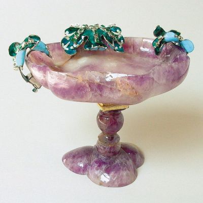 The lobed foot and articulated stem are carved from a single piece of amethyst, attached by a silver-gilt mount to the amethyst bowl. Turquoises and white enamelled flowers with emerald foliage adorn the lobes of the bowl. A relatively large number of such cups in amethyst and lapis lazuli were kept in treasuries belonging to European monarchs and aristocrats in the seventeenth and eighteenth centuries. One piece which formerly belonged to the celebrated Medici collection is today in the Pálazzo Pitti, Florence.