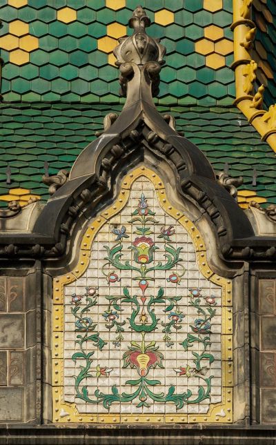 Architectural photograph - battlement with ceramic decoration of the corner dome, Museum of Applied Arts