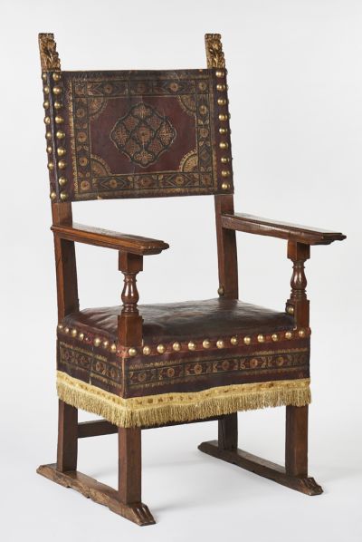The four legs of the chair stand on double sleepers. Two claw feet at the front. The straight arm supports rest on balusters. The rectangular back support is decorated with gilt acanthus leaves at the top. This type of chair is from Italy: its companion piece can be found in the Palazzo Davanzati in Florence.