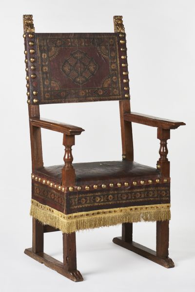The four legs of the chair stand on double sleepers. Two claw feet at the front. The straight arm supports rest on balusters. The rectangular back support is decorated with gilt acanthus leaves at the top. This type of chair is from Italy: its companion piece can be found in the Palazzo Davanzati in Florence.