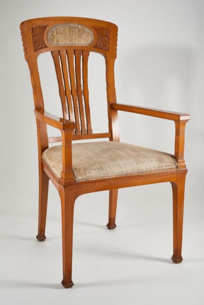 The four legs slightly curve outwards. It has plain arm rests and a pierced back support, enriched with five jointed laths in the middle, surmounted by a horizontal top with an upholstered oval in the centre, flanked by carved leaves. The seat and the oval field of the back support are upholstered in light green, striped plush. As parts of a dining room suite, these pieces were also presented at the 1902 Turin Exhibition, as it is verified by contemporary photos.