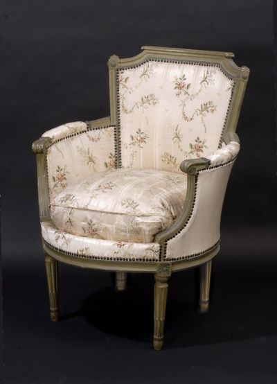 The chair stands on four splayed, fluted, cylindrical legs. Above each leg, the curved seat-rail is decorated with a rosette in a square. The upholstered, oval seat is combined with the bent armrests, and with the splayed, gabled back support. The two corners of the back frame are decorated with rosettes in squares. The chair is equipped with a detachable feather cushion.