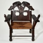 Although Ede Torockai Wigand (1869-1945) originally trained to be a decorative painter, his unquenchable thirst for knowledge led him to try his hand at the most diverse fields of art. It was as a furniture designer, however, that he reaped the highest rewards. His early pieces were inspired by international Art Nouveau, as well as the Arts and Crafts movement from England. Later, he acquired a taste for the forms and decorative motifs of Hungarian folk art, and increasingly turned his attention to the world of fables and fairytales. He spent several years in Transylvania, especially in the part called Székely Land, studying the characteristic features of the local folk-art traditions. His interests and his imagination led to the creation of this rustic set of furniture, which combines traditional Székely carpentry structures with carved figures from folk tales. He designed these pieces for his own home, and a picture of them was included in the book he published in 1916, titled The Decorative Courtyard [Hímes udvar].