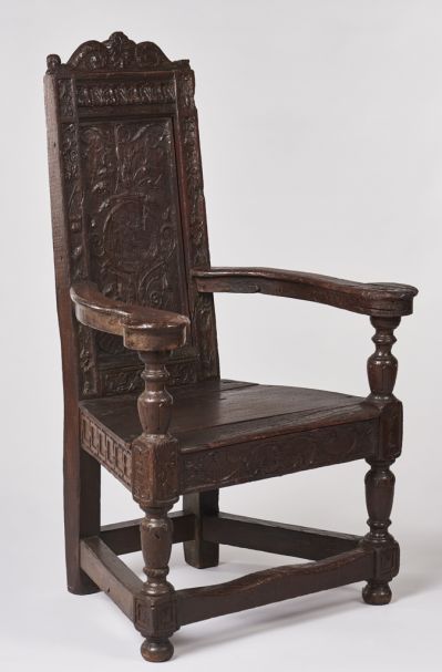 The front legs are turned, and bulbous the back ones are plain. They are joined by straight stretchers. The seat rail is carved with rosettes and leaves. The seat is trapezoid. The back support has initials OKF and PNE in a wreath of foliage and angel-heads. These are probably the monograms of the owner. Its pilasters are decorated with leaved tendrils, small boards and sacks. The top has voluted masks and scroll motifs. Its name probably originates from the French verb "Caqueter" = to chat, and it is also known as a "chaise a femme". Both suggest that this kind of chair was used by women members of rich families, when talking beside the fire-place. There are three variants that we know of at present: one has a pierced back support, one can be turned and the third has a very long back. The pieces described above belong to the third type. Companion pieces of the same quality can be found in Oslo and in the Victoria and Albert Museum in London. The slightly awkward shape, the motifs of the back support and the material (oak, instead of walnut) suggest that it was made at an early date, despite being mainly used in the second half of the 16th and in the 17th century.