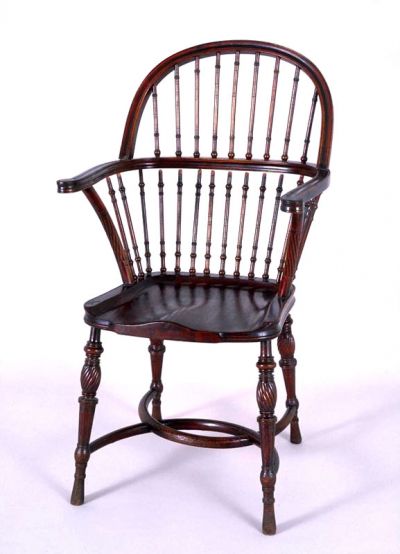 The chair stands on four turned legs that are fixed to the seat in an angle. The legs are joint by a curved double stretcher. The corners of the trapezoid seat are rounded the surface follows the shape of the body. The bent, horizontal U-shaped arm rest runs along the chair. A semicircular, bent back support joins the arm rest. The fields below and above the arm rest is filled with a lattice of turned sticks. Traces of a former paper note under the seat. According to the 1911-1915 Gebrüder THONET catalogue, this chair was type No. 6507.