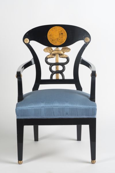 Each chair stands on four prismatic, slightly splayed legs the front ones rest on gilt balls, the back ones are slightly bowed. The vertical arm- supports are placed on the seat-rail, joining the arm-rests in volute motifs. The sides of the arm-rests are decorated with carved and gilt rosettes. The back legs are continued in the vertical frame of the back support its curved top is decorated with rosettes and a landscape in a round field, painted in ink. The middle pierced carving of the horizontal frame shows a Mercury column.