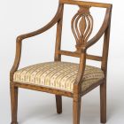 The prismatic legs are splayed at the front, with shoes, while the back ones are slightly bent to the back. The front legs continued into the curved arm-support, while the back ones are combined with the framework of the square- shaped back support. The top of the back is straight there is an inserted, carved an pierced vase motif, with a vertical, carved and gilt palmetta in its axis. The seat is trapezoid, with newer upholstery and a later cover.