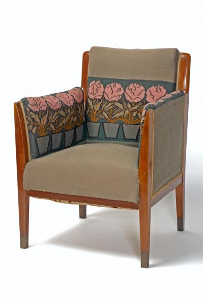 The armchair stands on four prismatic legs, the front ones supporting the arm rests, the back ones are continued in the back support. The seat, the space between the seat and the arm rests and the back support are upholstered in blue wool, woven with «Scherebeck» technique, with repeated motifs of a row of pots of peonies. A pair of curtains with similar pattern and weaving (Cat. No. 9.28) and a cushion (Inv.No. 52.3499) belonged to these armchairs. Previously they were part of the interior of the Hungarian hall at the 1905 international art exhibition in Venice. The picture of the interior was published in the periodical Magyar Iparművészet Vol.8, 1905 p.216. and Vol. 38. 1935 p. 15.