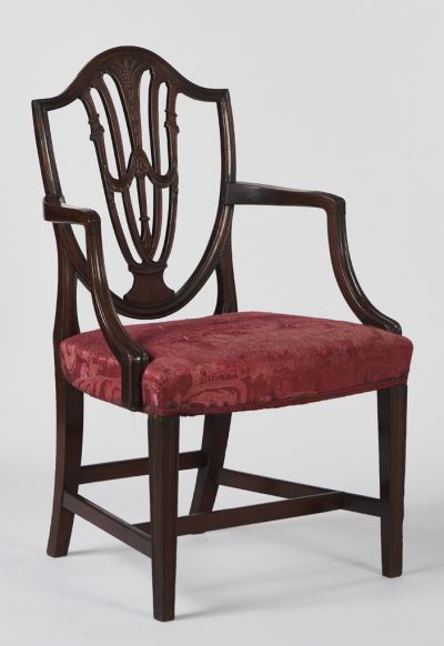 The square tapered legs are tied by horizontal stretchers on three sides, while the right and left ones are connected with a fourth stretcher in the middle. The two front legs are with cannelures, the two back ones bend backwards. The back forms a shield, and its lattice creates a lute, with carved oval rosettes and ears of wheat. The S- shaped arm-rests are held by curved supports. The shield shape is characteristic of Hepplewhite chair backs.
