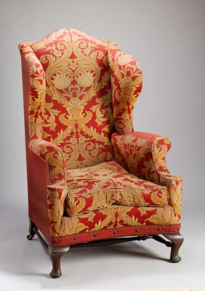 The chair stands on four short, curved legs. The armrests are cut in a curve at the front, bending outwards at the sides. The back is curved at the top, with wings on the sides. Detachable seat cushion.