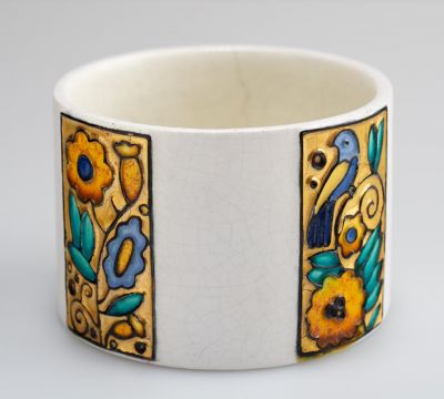 The straight, round foot supports a cylindrical body. The side is decorated with four rectangular panels of repeated pattern (each pattern is repeated twice on the object). The motifs are painted with "tube technique”, with leafy flower stem or a flower stem and a bird sitting on a tendril, lined by protruding contours. In the case of the bowl with Inv.No. 61.75.1 the inside and the base of the dish are covered with white glaze, the background of the decorating panels is gilt, the leaves are green, the flowers orange, the little bird is blue and yellow. The inside of the other dish is covered with colourless glaze, the outside is black, the background of the panels is colourless (letting the reddish brown of the original material appear), the flowers are painted in bluish white and yellow, the leaves are green, the bird is blue and yellow. The designs for these small pieces were published in the periodical Magyar Iparművészet (Hungarian Applied Arts), Vol 15, 1912, p.210, with an article about ceramic education in the School of Applied Arts. The sculptor Imre Simay and the specialized teacher, Vilmos Schleich, who was called to Pest from the Wiener Keramik workshop, encouraged students to follow the style of decoration of Josef Hoffmann and the Wiener Werkstätte - as it is apparent on these two objects.