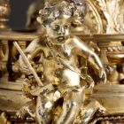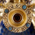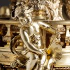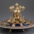 The large, flat tray stands on five plain, underrated claw feet. The indented bowls serve as holders for the desserts. The rim is enframed with wire, and then pierced. The middle part of the rim is enriched with jewels, alternating with almandines, emeralds and spear-shaped enamelled mounts. The surface of the bowl contains five blue, enamelled shell decorations, with garlands above them. Between the shells, there are posts, supporting cupid figures with different attributes: a hammer, a wheel, a cogwheel, in a miner's cap. The five-armed candleholder is supported by the central bun of a broad bottom.