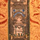 The pattern is typical of the early Renaissance textile designs made in Florence in the 1480s. It forms an undulating vertical line of thick boughs with large pomegranates on them, and scattered smaller pomegranates around. Paraments of similar fabric have been found in large numbers in the churches around Florence and Pistoia. Variations of the same pattern can be found in numerous collections, and they are usually looked upon as being the work of Florentine, Genoese or Spanish workshops. A piece identical with the one exhibited is in the Prato Museo del Tessuto (cf. Bonito Fanelli 1975, No. 8. - Florence, late 15th century). The vertical line of the embroidered orphrey shows the Madonna and Child, St. Stephen and St. Ladislas and a later destroyed, figure of St. Emeric, in an arched background. On the horizontal line are busts of St. Jerome and St. Augustine. Ruth Grönwoldt describes these liturgical embroideries with one or three domes as Venetian, or influenced by Venetian models, mainly on the basis of comparative studies in late quattrocento and early cinquecento Venetian painting. (Grönwoldt 1965, pp. 231-240). The chasubles found is Hungary that show the same motifs were registered by Mária Csernyánszky as "cum cruce venciana" on the basis of the Pauline Inventory of Budaszentlőrinc (1532). The chasuble with only one dome ("Miracoli") is Hungarian, modelled on Venetian pieces. There is a similar chasuble depicting figures of Hungarian saints in the Esztergom Treasury (Inv. No. 1964.299).