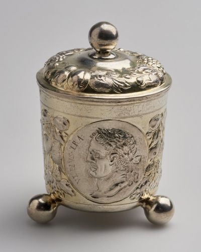 Stands on three bun feet. On the sloping, then tapering cylindrical body are profile portraits of emperors in three oval medallions, with engraved inscriptions: ANTONINVS / HADRIANVS / VLPIVS TRAJANVS. Among the medallions are chased fruits and foliage. It has a domed cover with chased fruits and foliage, and plain finial in the middle. It fits on the lip with an exterior rim. On the bottom is an engraved N monogram. The master's mark and city mark, beside each other, are both on cover and the bottom.
