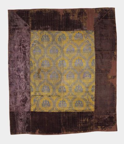 The scrolled foliage forms a system of netting lines of stylized pomegranates and stiff leaves alternate in the middle of each keel-shaped field. The border of the bedcover is made of several pieces of quilt velvet sewn together. The companion piece in the collection of the Budapest Museum of Applied Arts (Inv.No.52.2798) must have been a bed hanging. They can be identified with the following objects of the 1725 Inventory (note that in historic sources the coverlet was called "blanket"): "a violet velvet blanket with gold threads in the middle" "an old blanket of violet velvet with golden threads" (Inventarium Thesauri Fraknensis Anno 1725. Almarium Sub.Nris. 75 et 76. Nro.4.12 - Archives 236/1957).