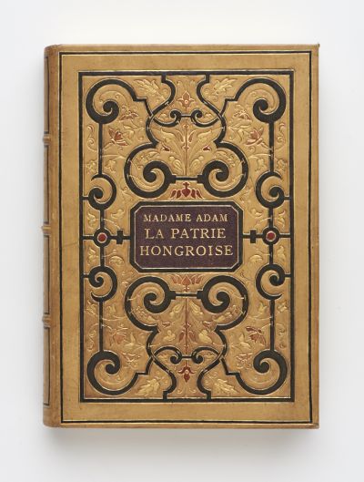 The plates are bound in ochre leather. The front one has a gilt, double line frame. The black ribbon border encloses the Grolier-style, scrolling, curved decoration of the surface, made of black-coloured leather applications with gilt rims. The spaces in between are filled with yellow tulips and red pinks, as well as leather applications embossed with gilding and gilt arabesques. The centre of the surface depicts a rectangular, burgundy-coloured leather application with cut corners, in a black ribbon frame, bearing the gilt title: MADAME ADAM / LA PATRIE / HONGROISE. The spine is divided into four compartments by three bands, each decorated with a black ribbon frame of a gilt rim. The second one of the top bears the gilt title inscription: MM ADAM / LA /PATRIE / HONGROISE. The bottom of the spine shows the date "1884". The other compartments of the spine are applied with polychrome leather: a black tulip with red leaves. The black plate is enriched with gilt tulips in the corners of the gilt double-line frame. The basic colour of the endpaper is gold, decorated with turquoise flowers, leaves and foliage. The edges of the papers are gilt, the headband is sewn of green and white silk thread, and the page mark is of white silk. Juliette Lamber Adam was a French writer her interest in Hungary was evident already in 1878, when she started a charity movement for the reconstruction of the ruined Szeged. In 1884 she visited Hungary and recorded her impressions of the journey in this book, which was also published in Hungarian, in 1884, entitled A magyarok hazája (The home of the Hungarians), by the Révai Brothers publishing company.