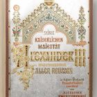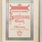 The paper binding imitates cotton, enriched with white, black and gold. The frame and central decoration of the front plate is emphasized by the stamping of the paper plate. The middle of the black and gold foliate frame shows a lobed ornament, bearing the title of the book. The typography follows the letter of old manuscripts, with medieval motifs between the letters: birds with flower stems, a hand rose in blessing, and griffins with human heads. The central ornament is topped with a ribbon plait, with stylised palmets and cross motifs alternating in its round compartments. The spine of the book is light brown leather, divided into compartments of various sizes by decorated with band-like plaited ornaments. The middle field shows plants in arches, the two side ones present two variations of Christ's initials. The narrow compartments in between are bearing the title of the book. The back is only decorated with gold the inside of the frame, resembling the coverplate, is filled with a network of stylised foliage, revealing the coat of arms of Svenigorodskoi (?), among flowery tendrils, in lobed fields. The endpaper shows an alternating, polychrome, geometrical patter over golden base, influenced by cloisonné enamel technique. The headband is red, blue, black and white. The edges are enriched with a network of stylised, red and gold palmets, with two blue geometrical stripes on the sides.