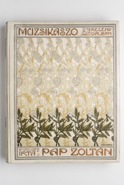 The songs of the poet, composer, publicist, and parliamentary representative Zoltán Pap and their associated sheet music were published by the Petőfi Society in a richly illustrated deluxe edition in 1910. The colorful, embossed cloth binding of the publication was made at the Nándor Gottermayer Bookbinding Institute, and its designer was Árpád Basch. The sophisticated, Art Nouveau appearance of the volume stands in sharp contrast to the content, the world of Hungarian-style art songs. The front cover is decorated with a series of pale violet blossoming thistles with a row of laurel branches below, and there is a double frame around the composition. Árpád Basch’s name is in the lower right, and the title is in a band at the top, while the composer’s name is at the bottom. The gold embossed letters of the title are connected by a delicate tendril decoration, which ends in a floral ornament, as if it were the stalk of a flower. Art Nouveau ornamentation also fills the area over the smaller lettering in the lower band. Its spine is decorated in a similar manner, with the title on a field of red. The harmonious, intertwined lettering appears again on the title page.