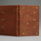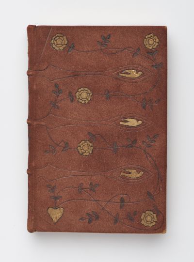 The front and back boards are connected with the ornaments that imitating mounts and clasps, following the position of the three bends. They end in almond-shape fields, with flying bird applications (the 1902 catalogue called these ornaments the «birds of time»). The cover plate is enriched with a curving, flowery rose stem springing from a heart motif. Similar rose stem with one blossom decorate the spine, which also bears the title in the second compartment. The endpaper is painted in black against a grey background, with vine tendrils springing from heart motifs. The headband is sewn with green.