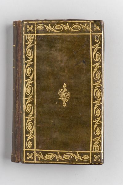 The plates are covered with green-painted leather. The surface is enframed with a strap frame of flowers and foliage, between two gilt lines. There is a rosette in each corner. The middle of the surface is decorated with musical instruments: guitar, lute and trumpet, hung on a ring with a ribbon. At the time of the restoration, the binding was put on the plates upside down. The saddle is divided into six fields by gilt lines the second field shows the gilt title: Erkoltsi/ Kezdokönyv, while the other fields are decorated with stylised lutes. The engravings of the blue endpapers are gilt, the sewn headband is a later addition.