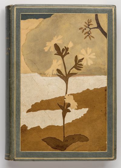 The front board and the back board have the same, linear frame. The surface of the cover is inlaid with several different, blunt shades of brown and white leather: a flower stem in front of a hilly background. The smooth spine bears the gilt title. The endpaper is fantasy-marbled in red and gray. The woven headband is red, yellow and green, equipped with a red silk bookmark. The edges are gilt. The same flower stem motif is applied by Gottermayer on an inlay- decorated notebook, exhibited at the 1898 Christmas exhibition (see Magyar Iparművészet Vol. 2, 1899, pp.16-17, the ill. on p.64.).