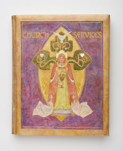 This binding was made with a special «vellucent» technique (created from the words vellum and translucent), invented by Cedric Chivers. It is essentially a polychrome, watercolour painted coating, covered by vellum which, in a special treatment, is made almost translucent. Traditional gold tooling over the parchment enhances the effect of lie ornaments. Mother-of-pearl inlays are often used on the polychrome vellucent bindings. (About the technique, see H. Granville Fell: A New Method of Decoration for Bound Books - the «Vellucent» Process. The Studio XXIX, 1903, pp. 169-176.) On the cover plate of the originally brownish-yellowish binding, there is a mandorla-shaped field of marbled bluish-purple-mauve background, framed with golden lines. A kneeling figure in mantle, surmounted by a halo, holds a ciborium in his hands. Behind him, the tree branches out to form a cross. The two sides of the cross end in spear-shaped fields, revealing a mother-of-pearl heart on both sides, among curving branches. The top of the longer stem of the cross ends in a cross-shaped field above the head of the angel, showing the dove of the Holy Spirit in the centre, flanked by two smaller, painted hearts imitating mother-of-pearl. There is an inscription on the two sides of the top corner of the mandorla, bearing the title of the book: CHURCH SERVICES. The back plate of the book has a central surface similar to the front board, enriched with a heart in each corner, painted to imitate mother-of-pearl. The central mandorla-shaped field of the back is smaller, showing a cross-shaped tree of life motif identical with that of the front. A ribbon floats in the front, with the dove of the Holy Spirit in its centre. The smooth spine is divided by three cartouches, the middle one bearing the title, the two side ones ornamented with strongly stylised, springing trees. The edges of the inside plates are decorated with stripes of gilt lines, enriched with a heart motif in each corner. The endpaper is spotted, brownish-yellow, according to the original colour of the binding. The headband is sewn with brown and black, the edges are gilt.