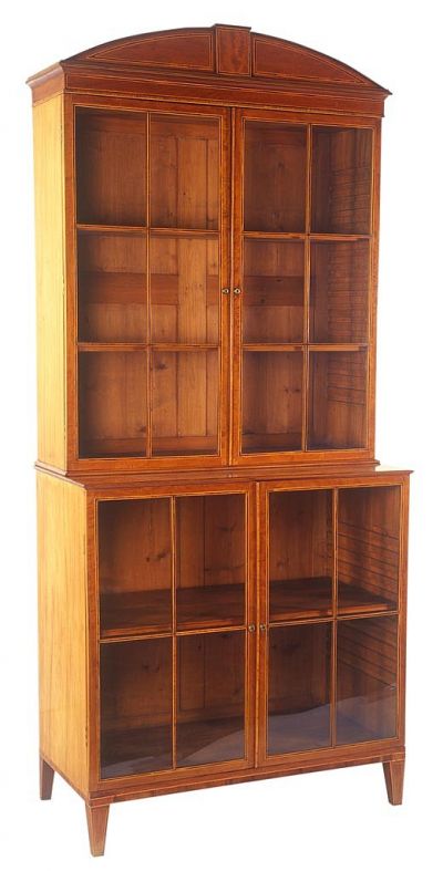 The case stands on four short, square tapered legs. Both the lower and the upper part have two glass-panelled doors, divided by a trellis. The horizontal top corniche is surmounted by a semi-circular crest. There are two adjustable shelves in the lower and three in the upper part. It is a steady, elegant, simple piece with a graceful structure.