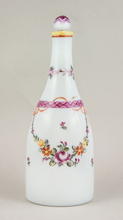 The cylindrical carafe with a narrow neck has a ball-shaped stopper. The bottom of the neck is lined with spot and lozenge motifs, enriched with ribbons and garlands of flower bunches at the bottom. Below and between the garlands is a flower. The boughs decorating the neck are lined with bunches of flowers, while yellow and red lines run along the top rim. The stopper is painted with a purple flower. The dominant colours of the decoration are: purple, red, yellow and green. The bottom of one of the carafes is painted with an "H" in red and blue and an „11” in blue, while the other shows „10” and a red „16” crossed with blue - these are probably marks of porcelain painters, as yet unidentified.