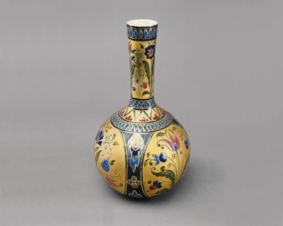 Its colour painted, signed, dated (“Z. T. 1879 21/XI”) plan sheet survived in Pécs at the Janus Pannonius Museum (inv. no.: AD 61.447.46). Façon (mould) number: 553 décor (decoration) number: 334. The technical specialty of the object is the colourful lustre glazing that can be seen on the tulip petals (oxidated calcination). Its ornaments follow the pattern of late Renaissance Hungarian aristocratic embroideries and the seventeenth century North Hungarian and Transylvanian faience vessels, at the dawn of the national ornament style. In her memoirs Teréz Zsolnay quotes her father’s, Vilmos Zsolnay’s letter:“In your work a new, independent and dynamic Hungarian style is coming to life. Follow this direction I expect a lot from it!