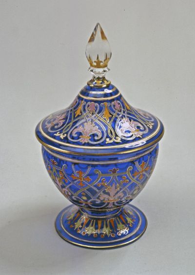 The broad, conical foot supports a hemispherical body with a conical cover. The finial is faceted into six sides like the tip of a spear its bottom is lined with Bourbon lilies. The foot, the body and the cover are painted with stylized Bourbon lilies and flowers in green, orange, blue and pink as dominating colours, connected by plaited foliage. The decoration is enframed with gold. This object was functioning as a jewel box. It is an outstanding masterpiece of historicizing-Art Nouveau Hungarian glasses, both from a technical and from an artistic point of view. (See the donation register of the Zay-Ugrócz Glass Factory, 1896, IM Archives KLT 144. Ékszertartó sötétkék, égetve ornament aranyfonatok, a fedő hegye kristaáy csiszolva /Dark blue jewel box, with etched gilt platis and a crystal-faceted finial/).