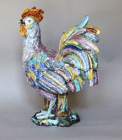 The cock-shaped bowl stands on a base of irregular shape, supported by a tree trunk. Its upper part serves as a detachable cover. The body and the feathers are elaborately modelled, with realistic painting. The colours are mainly manganese and brown yellow, cobalt, turquoise and iron-red, out-lined with black. Similar bowls forming animals or plants were made in France from the beginning - and in Germany from the middle - of the 18th century, and in Holies from 1748. Marked on the bottom: H in manganese.