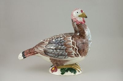 The bowl on a round stand forms the shape of a turkey its upper part is detachable cover. The turkey's head is turned to the right. The bowl is one of many popular bird-shaped pieces. The elaborate, realistic modelling reflects even the feathers of the bird, which is emphasized by the colouring. Colours: mainly brown, outlined with black, with a little red and green. Bowls like this served as a dish for soup or stewed fruits.
