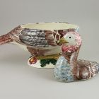 The bowl on a round stand forms the shape of a turkey its upper part is detachable cover. The turkey's head is turned to the right. The bowl is one of many popular bird-shaped pieces. The elaborate, realistic modelling reflects even the feathers of the bird, which is emphasized by the colouring. Colours: mainly brown, outlined with black, with a little red and green. Bowls like this served as a dish for soup or stewed fruits.