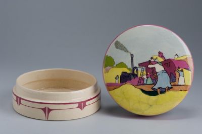 The cover of the plain, round box is slightly domed. The bottom is decorated with geometrical pattern, painted in dark violet. The side of the cover has two broad, light violet stripes. The cover depicts a harvest scene, with a smoking steam threshing machine and working figures. The different sizes of the front, centre and rear figures create perspectives. The interrupted, sketchy black contours are painted with vivid, homogeneous, happy patches of yellow, purple, brown and green. The growing interest in national, Hungarian topics and the new stylistic trend in decorative arts are apparent in the series made during the cooperation of Béla Pálinkás and Emil Fischer. Their first successful introduction at the 1903 Christmas exhibition of the Society for Applied Arts was followed by a great number of table sets, ornamental dishes with similar decoration. A "majolica with small Hungarian pictures" was exhibited by Emil Fischer in Milan, 1906.