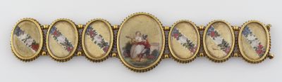 The bracelet consists of seven oval medallions the central one is the largest. They are in a gold wire setting, equipped with four small loops. The parts of the bracelet are connected with two ball-shaped chains on each side. The medallions are made of aventurine glass, painted with Neo-Rococo motifs the central one depicts lovers learning music, the others show diagonally placed flower garlands.