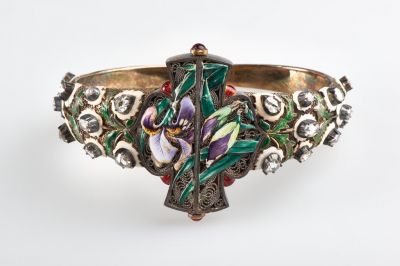 This luxurious jewel, decorated with diamonds and covered by fine enamel of various colours, was shown at several exhibitions at the turn of the century. Its designer, painter Gyula Hary (1864–1946), who was mainly known as a graphic artist and illustrator, demonstrated his talents in several braches of the applied arts. He won several prizes at competitions organized by the Hungarian Society of Applied Arts for his designs for porcelain dishes, maiolica table decorations and bracelets. This bracelet decorated with the popular flower of Art Nouveau, irises, was executed by the excellent goldsmith of Parisian training, Samu Hibjan (1864–1919), who also worked together with several other Hungarian designers of the period. His fame largely stems from his activity as an artist and teacher of enamel techniques. In 1895, he became a teacher at the Hungarian School of Applied Arts, where he had founded the department of enamel. He applied several enamel techniques, including painted Limoges enamel, filigree enamel, etc. on his works. He won the grand prize at the 1896 Millennial Exhibition in Budapest, a silver medal at the 1902 International Exhibition of Modern Decorative Arts at Turin, and a state medal for applied arts in the same year. This brilliantly executed piece, which presents several jewellers’ techniques, decorated with gemstones, enamels and filigree, was shown at the 1900 Christmas exhibition at the Museum of Applied Arts, and at the Turin exhibition two years later. The Museum purchased the set exhibited there.