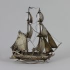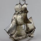 The curved foot supports a brig, with three figures on the deck: one of them is at the steering wheel, the other stands in the middle of the boat, while the third is behind a canvas. Both sides of the brig have six gunshots, in a stripe decorated with a geometrical pattern. The back is enriched with a stamped, five-pointed coronet rising out of pierced leaves. Two flags appear on the top.