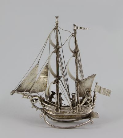 A brig with three sailor figures in hats, placed on a bent silver wire foot. The back of the board shows the repousse figure of a rampant lion the front is decorated with a scrolling crest. The sails are fixed to the body with wires.