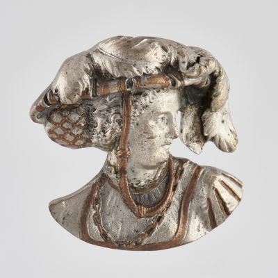 A repousse, relief-like brooch influenced by jewels of the Netherlands, both in its technique and decoration. It depicts a bust of a young woman in a dress with lace collar, wearing a hat with feathers. The net on her hair, the decoration of the hat, the décolletage of her dress and her brooch are coloured with bronzing.