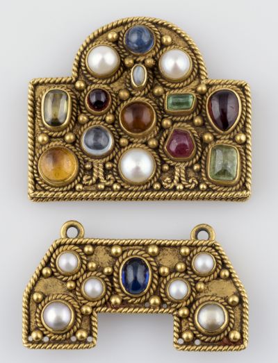 The clasps consist of two parts on one, there is a semicircular part connected to the rectangular base, enframed by a twisted, plaited rim. Its pair is a cut rectangular for, with refined corners. The surface of both is covered with precious stones in cases - a typical decoration of oriental jewellery - in a scattered, fancy arrangement.