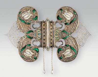 The filigree buckle consists of two three-lobed parts that resemble lilies. It is decorated with polychrome enamelled ornaments: naturalistic tulips bending outwards from the middle vase. The lock is enriched with seven tiny diamonds in a column on either side, equipped with a chain for the pendent pearls. The buckle can be opened by pushing the fluted knobs at the top and bottom at the same time. The technique and motifs of the decoration are good examples of the national, folkloric trends of Hungarian Art Nouveau. The buckle was exhibited at the 1904 Christmas exhibition of the Hungarian Society for Applied Arts.