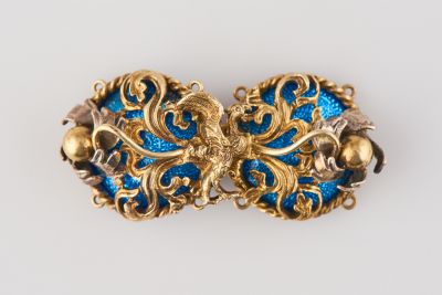 Both clasps are round, covered with dark blue, translucent enamel on the surface and on the reverse. The surface is decorated with repousse, translucent, lighter blue enamel over an engraved base and enriched with pierced, Gothic-style, leaved decoration and a relief bird.
