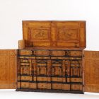 Kunstschränke, cabinets created through the co-operation of joiners, inlay artists, carvers, lathe operators, jewellers, and painters, represent the high point of South German Late Renaissance furniture art. In their fabrication, as well as highranking customers – monarchs and aristocrats – the entrepreneurial traders of the period who organised the complicated work processes and who distributed the finished articles played a very important role. One such owner of a firm was the wealthy Augsburg patrician Philipp Hainhoffer (1611–1632), from whom presents were ordered for, among others, King Gustavus Adolphus of Sweden (1611–1632). The particularity of the Budapest cabinet stems from its rich inlay decoration. This embellishes the entire surface of the piece inside and out: set among mount decoration 63 and intertwined creeper with flowers and acorns, winged female masks, female figures playing lutes and violins, real and imaginary animals, and other motifs appear before us. The tympanon-type doors conceal boxes. While the intarsia version of the mount decoration found in jewellers’ pattern-books and the mottled bird motif are characteristically South German, the luxuriant mesh of creepers ending in animal heads and the grotesque elements indicate familiarity with the small engravings made by Jacques-Androuet Ducerceau (1510–1585) and Etienne Delaune (1519–1583). The compositions of both masters were popular in the second half of the 16th century the latter – who was an engraver and jeweller – published his finely drawn and elegant engravings in 1576, precisely in Augsburg. The influence of these compositions shows outstandingly on this magnificent creation. On the South German Mannerist furniture – and on our piece also – there already appears drilled inlay, on the design of which the image is produced in a mosaic-like way from specifically Central European woods, utilising the natural beauty immanent in the wood.