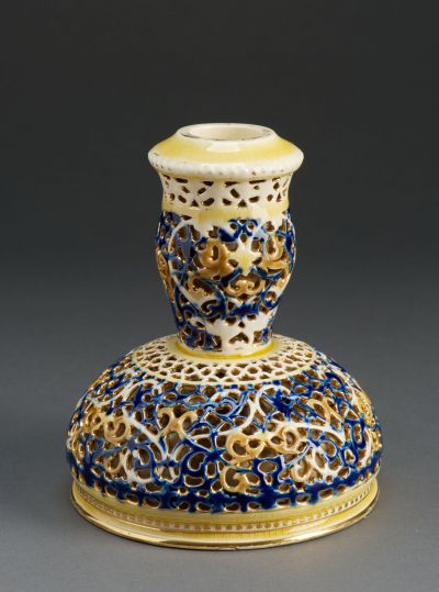 Techniques: | gloss-gilded; mould thrown; pierced decoration; with high-fired polychrome glaze |