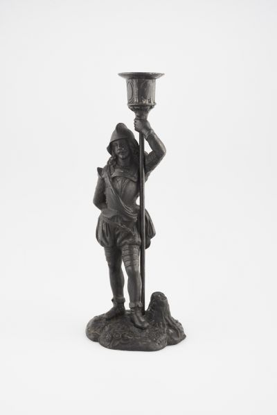 The round plinth imitates an uneven ground, where a soldier figure, dressed in medieval armour and helmet stands, beside a tree trunk. Instead of a spear, he leans on the rod that ends in the candle socket with his left. There is a stamped number seven on the bottom, probably the type mark of the series.