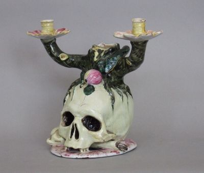 On a violet base is a skull with a leg bone under it. On the top of it is a trunk, from which the two arms of the candlestick branch out, with round, foiled candle rings. On the green tree-trunk a snake winds its way towards the apple on the skull. The colour is mainly white, green shaded with black, and a little yellow, purple and black.