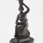 The most frequent type of candlesticks made in Munkacs. Two variants are known they differ in the shaping of the plinth and the kneeling female figure. The plinth with eight sides supports a female figure, bending on one knee, dressed in a loose gown, with naked breasts. She leans on her leg with the right hand, while with her left she holds the rimmed candle socket, placed on her head, marked with cast majuscules on the bottom of the plinth: MUNKATS.